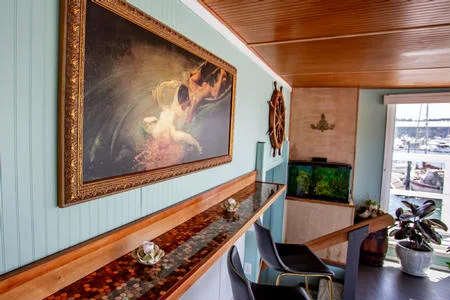 The Newport Belle was built in 1993 and renovated starting in 2020. The 97 foot boat B&B features five well appointed state rooms, three on the 1st floor and two on the 3rd floor. All rooms have private baths, king or queen beds, high-end Italian made linens & thoughtful touches throughout. The boat features a number of inviting areas including 3 separate outdoor sitting areas, private dining tables for all guests & a living room with a wood pellet fireplace stove for winter months & cool summer nights.