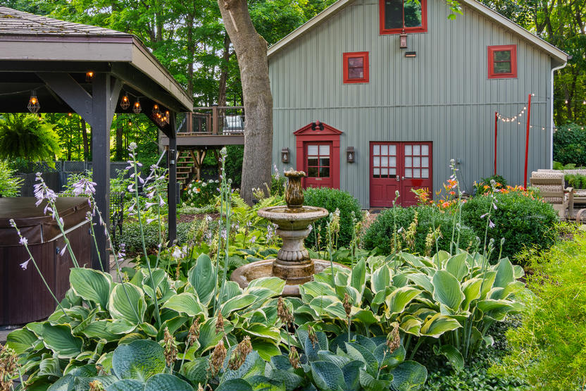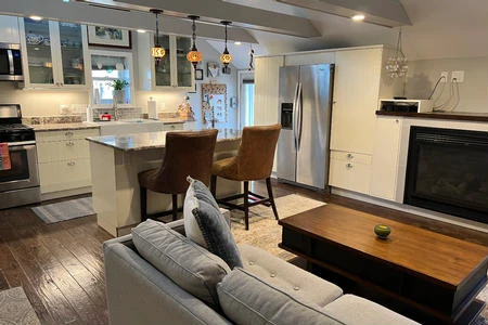 Fabulous Owner's Quarters on the second floor of the "Barn" with a modern kitchen, open concept living, gas fireplace, spacious walk-in closet and a 16'x16' composite deck with views of the lush gardens.