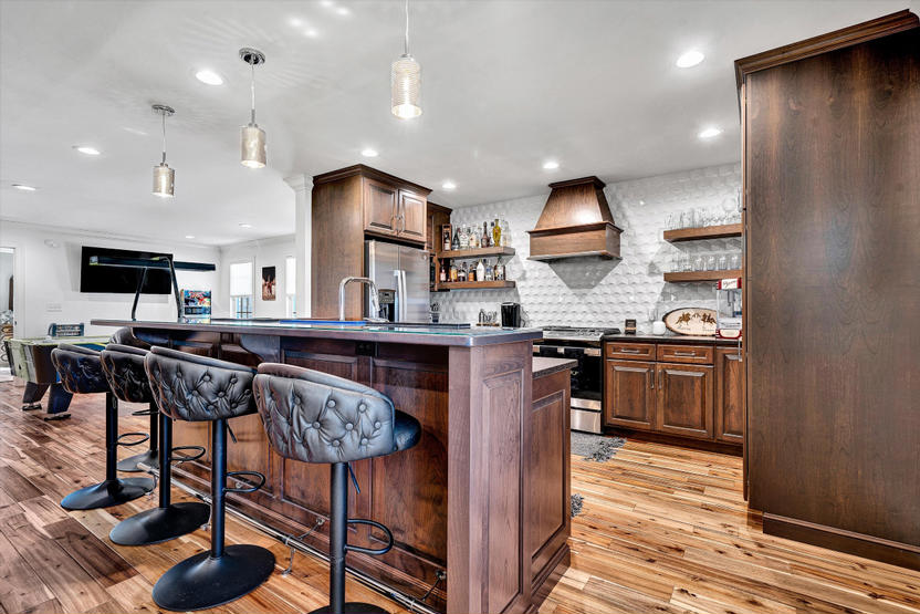 A breezeway connects the original portion of the residence to a 2023 addition featuring a garage and exercise room on the first floor and an apartment/guest quarters with a bedroom, bath, kitchen, and game room on the upper level. Together, the original portions of the home and the additions total more than 7,000 SF of finished space and offer 5 bedrooms and 7.5 baths. A front porch, balcony, screened porch, and open patio area with a hot tub provide outdoor living spaces. A saltwater pool with retractable safety cover and a pool house with bath were added in 2023.