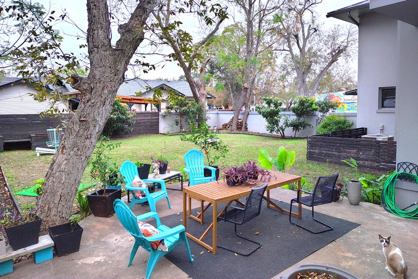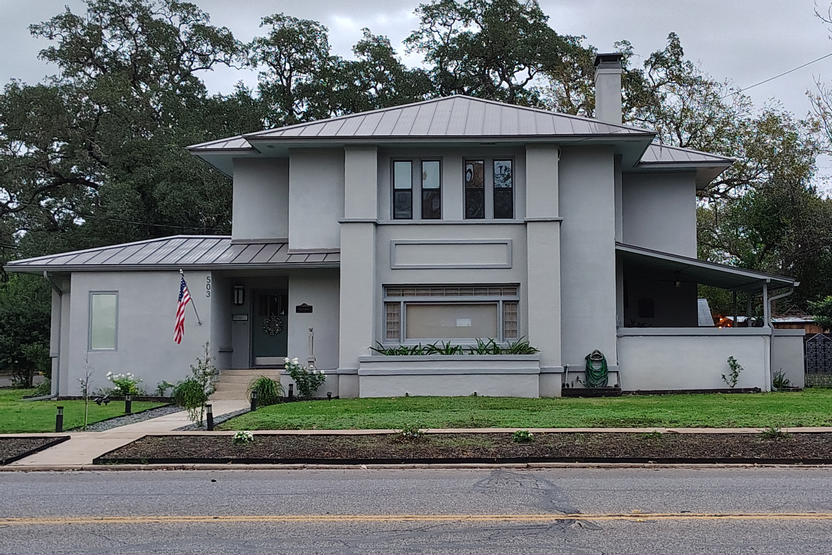 Exterior of the house began with restoration of the stucco. Standing Seam Metal Roof was performed with new gutters and soffets. Painting of house was with the highest quality paint in Downtown Gray and Sharkfin trim – all Wrightian colors. The backyard and utility areas are bordered with Shou Sugi Ban fencing. The front landing accents Midway Garden Fairy from FLW collection. Entry stairwell to Seguin House of Games was upgraded to code with new railing. The 1800’s garage was restored with new modern remote garage doors. New energy efficient doors replaced damaged doors. The original irrigation system was upgraded to modern Rachio system. The front yard was overhauled with Bermuda grass and white flowers – roses, lantanas, plumbegos, and plum trees. An organic English garden of vintage bricks is on the Live Oak side with tomatoes, cucumbers, okra, and peppers.