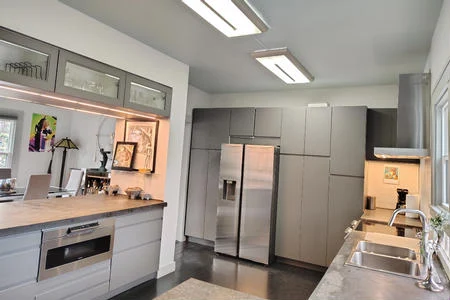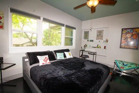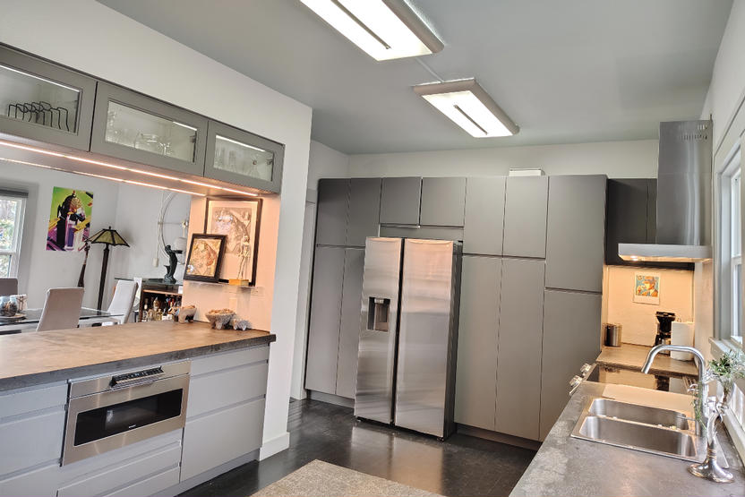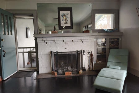 First floor was gutted with the theme “What would Frank do!”, approximately 2000+ square feet. The portico was transformed to the office with a new split unit HVAC system. A fake ceiling was removed to reveal original beaded board, restored. Built-in Shou Sugi Ban shelving. 42 windows were replaced with energy-efficient windows and covered with gray remote controlled black out shades. The electrical system was upgraded to current standards. Plumbing was upgraded as well. HVAC system was totally replaced on first and second floor. The original fireplace was lovingly renovated. The original curio with stain glass in the living room was personally restored by Debbie. The large picture windows in the front of the house were restored by Joe and Debbie. The hardwood floors were preserved with black stain. The stucco walls were restored and painted FLW colors of Titanium Gray with Graphite Gray trim. The ceilings were restored with Haunt Aqua Blue paint. The kitchen was recreated into a modern space with massive, luxurious Ikea cabinets and gray concrete countertops, and new stainless-steel appliances including a microwave drawer. The 1920’s glass block was preserved. The two bathrooms were upgraded with a Japanese soaking tub, concrete and tile shower, and Japanese Shou Sugi Ban cabinets and porcelain sinks. Joe created Debbie a charming library with modern shelving to accent the bay windows. Did we mention built-in Ikea storage and Infrared Dry Sauna in the transition room?