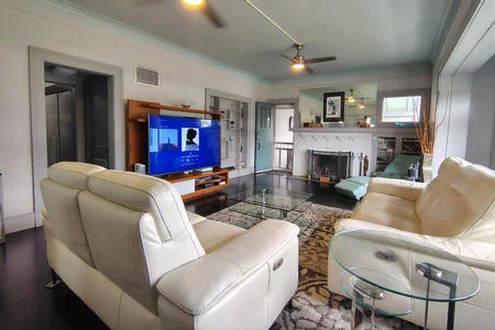 Wander upstairs to the second floor, Seguin House of Games, an architectural gem has been thoughtfully rebuilt to honor its Wrightian roots while offering modern comfort and whimsical charm. Private second-floor sanctuary spans over 2,000 sq ft and features four uniquely themed rooms: the Danish-inspired Chess Room, Mission-style Scrabble Room, 1940s Futuristic Monopoly Room, and the tranquil 1930s Oriental Zen Trivial Pursuit Room. In the center is a Gathering Room. Retro-modern kitchen is rebuilt with Ikea cabinets. 1920’s glass blocks were restored to accent the kitchen. Two bathrooms have a Japanese soaking tub, walk-in showers, and Japanese Shou Sugi Ban cabinets and porcelain sinks. The hardwood was restored with black stain. Windows were upgraded with high-efficiency window systems. Electrical was upgraded to current standards. Plumbing was upgraded as well. Original doors were lovingly restored with glass knobs and original hardware and modern Schlage.