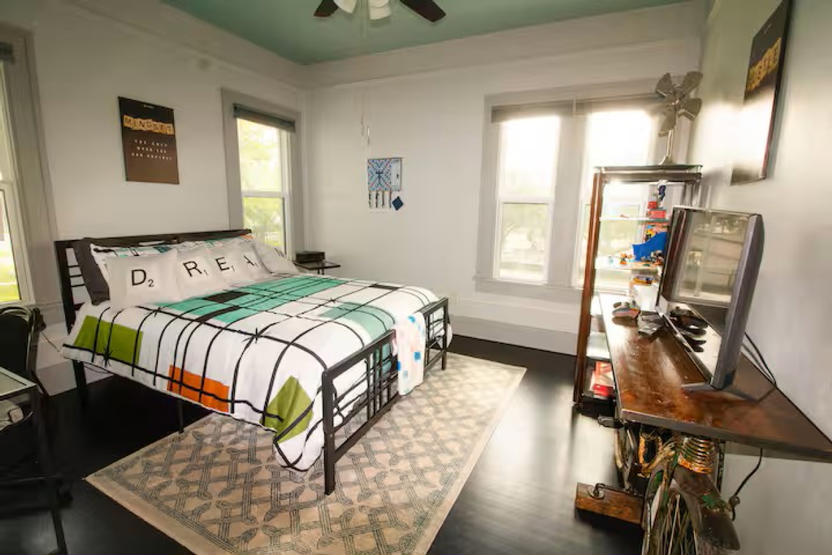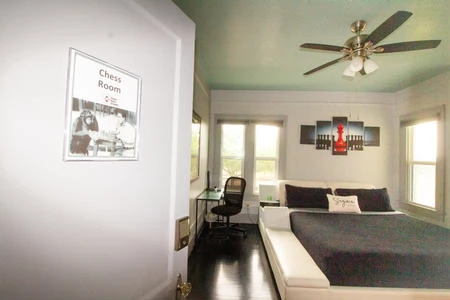 Joe and Debbie Pedigo bought the house in March 2020. Severely in disrepair and during the pandemic, they performed an extensive renovation. Debbie’s vision was to retain residence on the first floor and create a small boutique hotel / short term rental on the second floor with themed rooms of their family’s favorite games including their favorite game – poker.