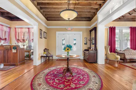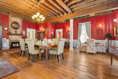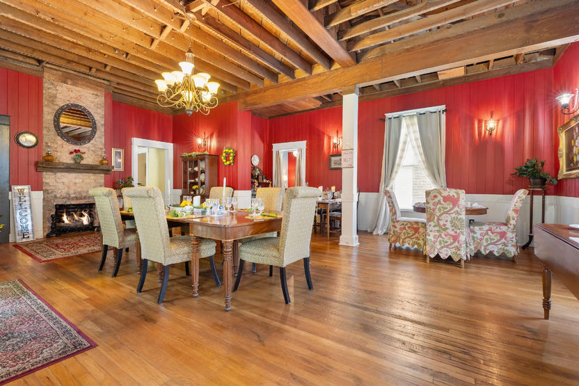 As you enter the oversized foyer, you are greeted by original hardwood floors, tall ceilings, and preserved architectural details, including exposed original beams and ceiling elements that highlight the home’s craftsmanship. The main living areas flow graciously, creating both intimate gathering spaces and larger entertaining rooms. The inviting dining room, anchored by a gas fireplace, has historically hosted shared meals and celebrations, while a cozy breakfast room connects to a well-appointed kitchen designed for hospitality use.